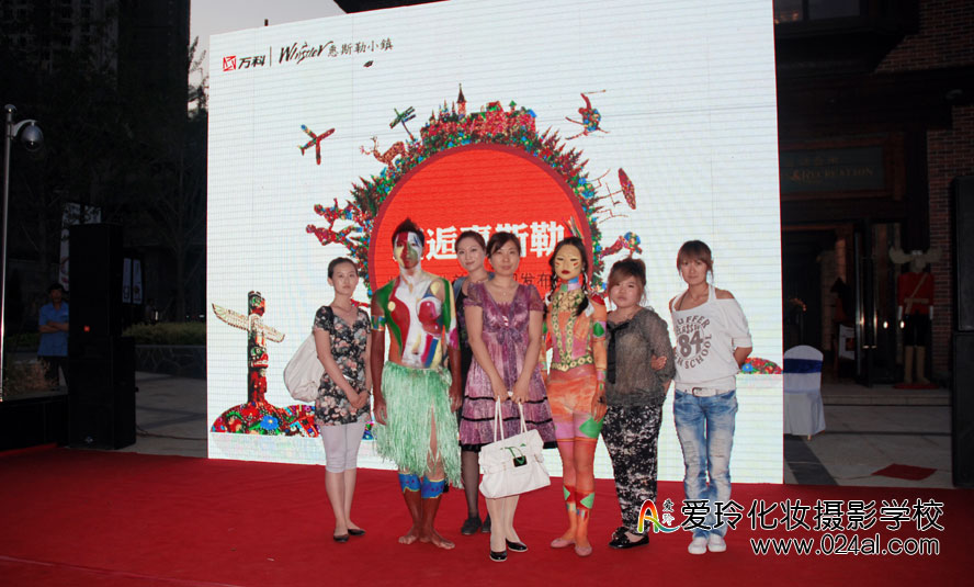 在万科惠斯勒小镇的开盘仪式上,爱玲化妆学校受邀为其主持人、模特、演员化妆造型。万科惠斯勒小镇完全以北美风格进行打造,而在开盘仪式上为凸显其风格,所有的模特演员均以北美复古的风格进行装扮,印第安人造型的男女随处可见。此造型装扮需要在身上、脸上涂抹大量的燃料,而如何把燃料涂抹的真实、自然便是考验学员的一大难题;同时,在其脸部的妆容上,也要遵循北美印第安人那种狂野的气质,眼睛、脸颊、嘴部的勾画都需符合印第安人的特点,如此难度的装扮,使学员在此次实践过程中得到了很多收获。